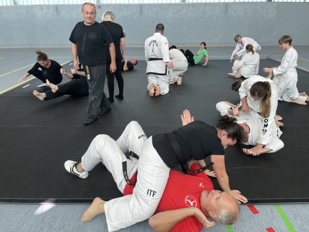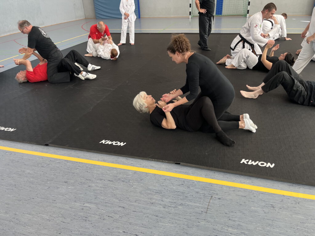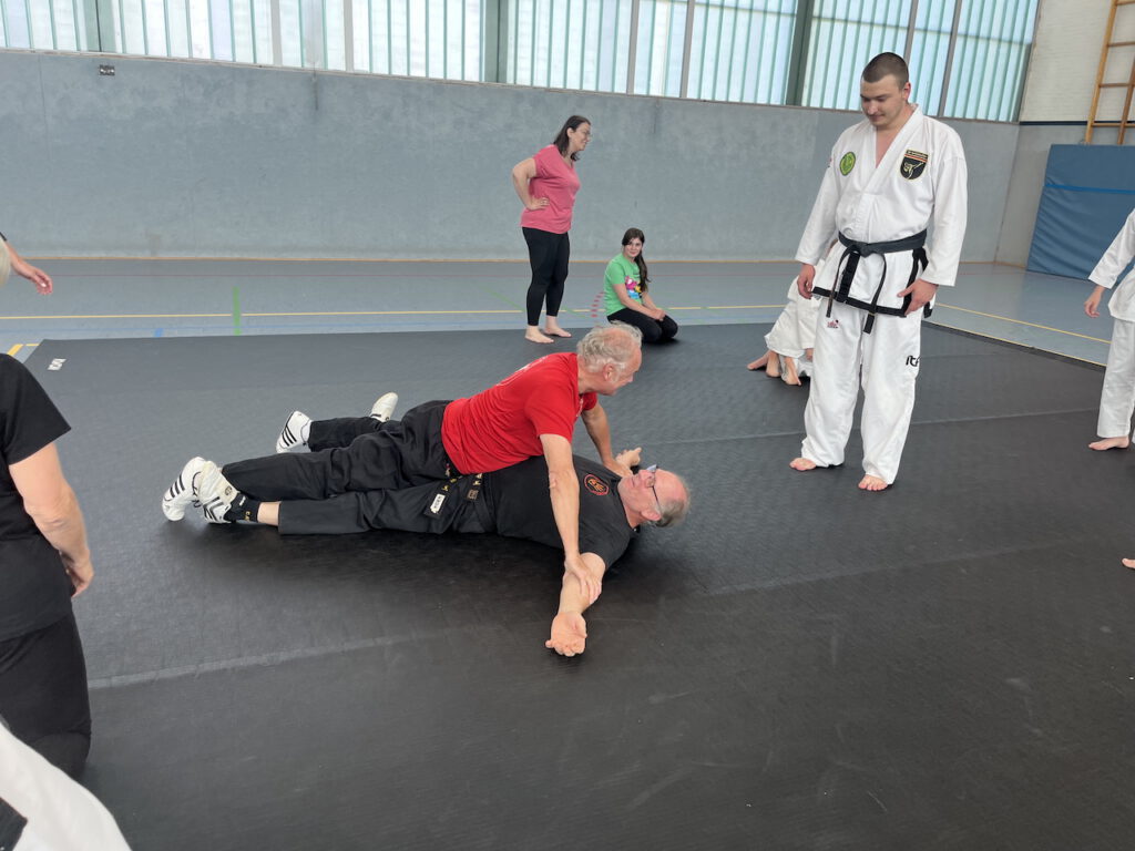 Der Lehrgang begann mit verschiedenen Befreiungstechniken aus der Bodenlage. Drei effektive Aktionen wurden gezeigt und intensiv trainiert. Anschließend folgte der Themenblock Entwaffnungstechniken, sowohl Stock gegen Stock als auch Stock gegen unbewaffneten Angreifer. Auch hier stand das praktische Üben im Vordergrund, was bei allen Teilnehmern auf großes Interesse stieß.Nach über zweieinhalb Stunden schweißtreibenden Trainings widmete sich die Gruppe den Nervendruckpunkten. Ziel dieser Einheit war es, Wege aufzuzeigen, wie man sich mit gezielten, aber kontrollierten Techniken aus bedrohlichen Situationen befreien kann – mit möglichst geringem Kraftaufwand, aber hoher Wirkung.